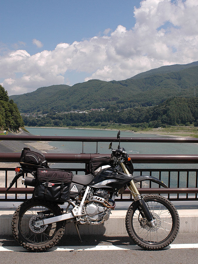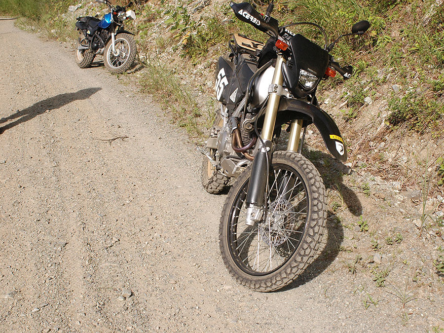 《ロープロ・ローバーAW II》キャンプの道具は、恐らくこれ以上軽量化するとなると、アイテムそのものを外さねばならないんじゃないか、というところまで減らしたつもりでした。その甲 斐あって、オンロードを走る分には何らストレスなく走る事が出来ました。が、これがラフロードとなると、そうは問屋が卸しませんで、後述する様にもっと体 重と装備を軽くしない事には(それと、テクニックを向上させて恐怖心を克服する)、いっかなXR250の動力性能をもってしても、林道を突破する事は難し い、という事を思い知らされる結果になりました。