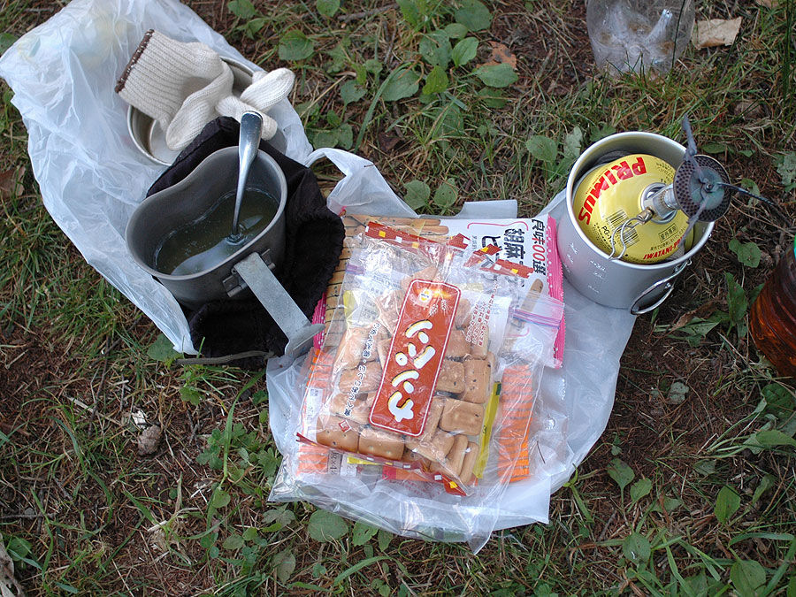 晩飯食ったあとは、キレイな星空の下、日本社会の行く末と宇宙の深淵について、まことにアカデミックな会話を楽しんだ訳ですが(そういう事にしておこ う)、明日も早いという事で2300時ころ就寝。昼の段階では、テントの中は相当暑いかな、と思っていたのですが、さすがは山の上。陽が落ちると共にずん ずん気温が下がって、長袖のジャージを着込んだくらいですから、テントの中も良い感じに涼しくなっていて、それでいてシュラフに潜り込まなくても良いくら いの気温でした。暫くぼーっと寝転がっていたのですが、その内、ウトウトと寝てしまい、途中、腰が痛くなって寝返り打ったりしながら寝てる内に、0500 時に目が覚めてるという快挙を果たしました。