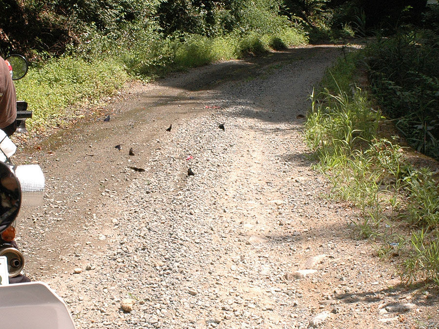 林道では転倒さえしなければ何の問題もなく、首から提げ続ける事が出来る事が判りました。ただし、転けた時はもれなく地面に叩き付けられたり、自分にぶつ かったりして壊したりケガする可能性が大ですので、突破不能な林道には進入しない方が良さそうです。また、道が乾いている場合は、前走するバイクが巻き上 げる砂埃でカメラが真っ白になります。今回レンズを換えなかったのは、カメラがすでに埃まみれだったからでもあります。ブロアーの装備の必要性を感じまし た。