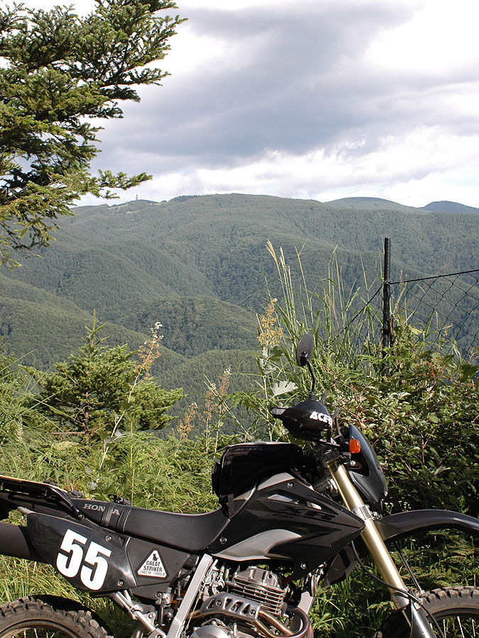 ところで、今回のキャンプツアーは、入笠山周辺の林道も走ろうというのが含まれていました。だから、当然買い出しに行くのも、わざわざ林道を使って行く事 になりました。装備は首から提げたカメラとタンクバッグのみ。ヘルメットのシールドは使わずゴーグルを着用し、「防寒具」の異名が定着したアルタのニー パッドを膝に当てて出撃しました。