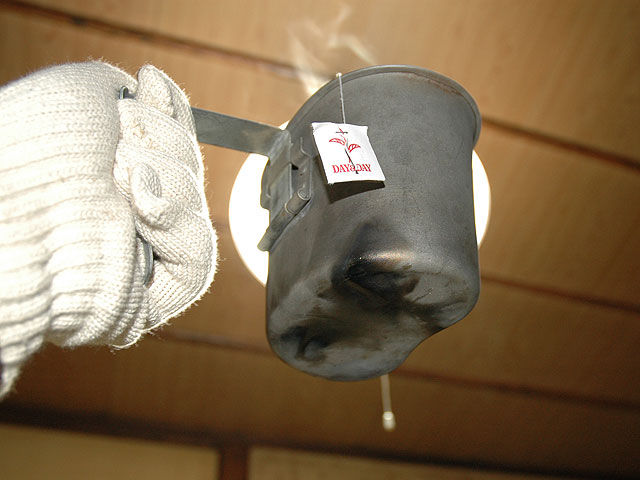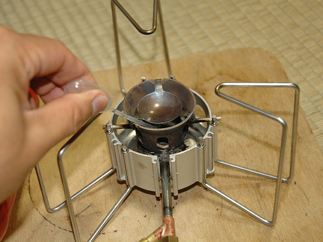 マルチフェールという事で、軽油やジェット燃料なんかも使えるらしいですが、日常的にありふれた燃料としては、レギュラーガソリンと灯油という事になろうかと思います。NOVAの場合はジェットの交換なしにどっちの燃料も使えたらしいですが、ドラゴンフライはジェットの交換が必要です。もっとも、 NOVAは灯油を使うと鍋底にべったりタールが付くとかで、だったらジェットは交換式の方がいい、という意見が多い様です。自分の場合はバイクで行動がメインですから、とりあえずはレギュラーガソリンで事足ります。で、早速燃やした訳ですが、キレイに青く燃焼し、とろ火にしても煤も出さず、鍋底もあまり黒くならず、さすがは堂々と自動車用ガソリンも使用可と書くだけの事はありました。