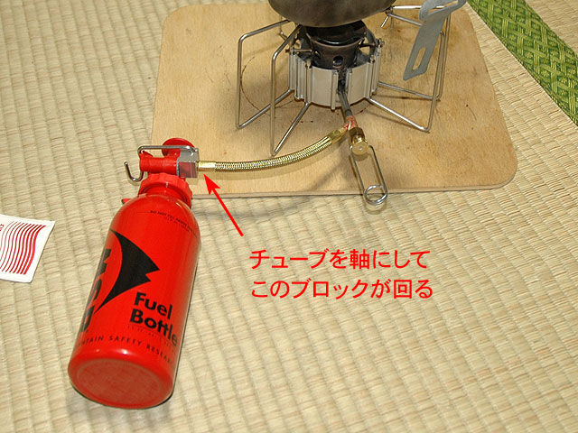 通常の消火方法では、ワイヤーハンドルを全開にして、コントロールバルブを閉めて、フェルチューブの燃料を燃やしきって消化する要領ですが、この方法だとフェルチューブをボトルから抜いた時、どうしてもフェルチューブの中に残った燃料が漏れてしまいます。そこで、オプティマスNOVAと同様に、ボトルを反転させ、内圧を抜く要領で消火してみました。ただし、ドラゴンフライのフェルチューブはNOVAほど長くも柔らかくもないので、NOVAと同様の曲がり方はしません。そこで、フェルチューブとボトルをつなぐブロックの部分を回す事で反転させます。
