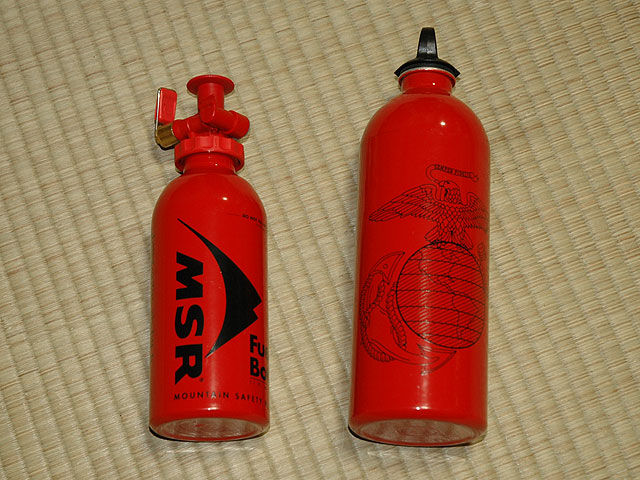 MSRには11、22、33ozのボトルがあるのですが、まぁさすがに1泊程度の作戦が多い訳ですし、ガソリンはそれこそバイクのタンクにいっぱいある訳ですから、一番小さい11ozで大丈夫と判断しました。というか、あまり大きなボトルを持ちたくないですし。一応、アメリカ海兵隊仕様の22ozのボトルもありますが、複数人ですき焼きでもやらない限り、まずは必要ないでしょう。ボトルのフタの代わりにポンプを付けっぱなしにするのは、見た目は大丈夫そうです。ただし、ポンプ部に軍手などを被せて保護しておいた方が安心出来そうです。もっとも、使わない時も付けっぱなしというのは感心できないので、保管時ははずして通常のキャップを付けた方が良いと思っています。