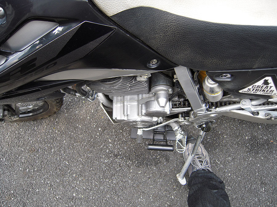 上げ方は、まず車体を起こして垂直にして、リフトをエンジンの下辺りに潜り込ませます。微妙に位置がずれると、前輪や後輪が下がって地面に着く、という事があるので、各自良い感じの位置を探ってください。