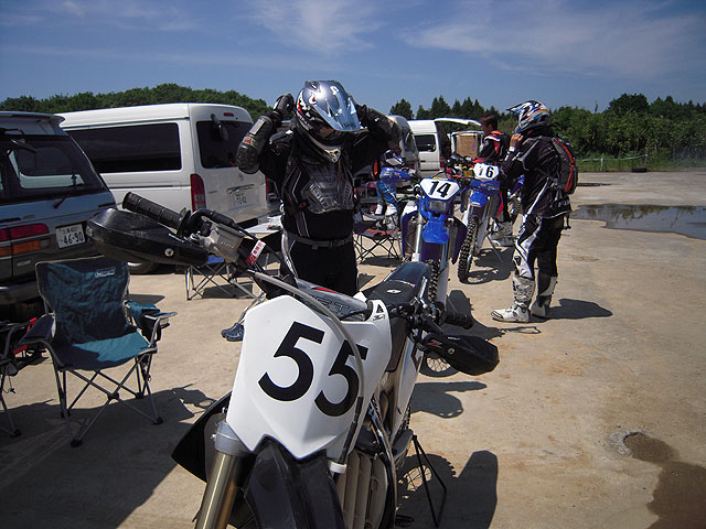 パドックでは早くもdb殿やS田さんが試走から帰ってきていましたが、バイクがドロッドロ。聞けば大坂を下って獣道の先の上り坂が、エライ事になっている、との事(今回は左回り)。確かに、その辺りに差し掛かった時に、物凄くアクセルを噴かす爆音が聞こえてきたので、相当滑る様な感じがしました。帰ってきたdb殿から「試走に行かないんですかw?」と言われましたが、走る前からバイク汚したくなかったので、遠慮しておきました(笑)