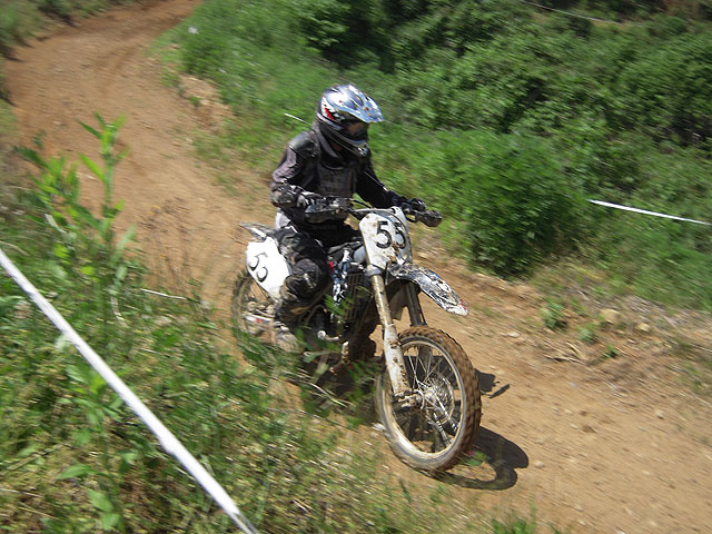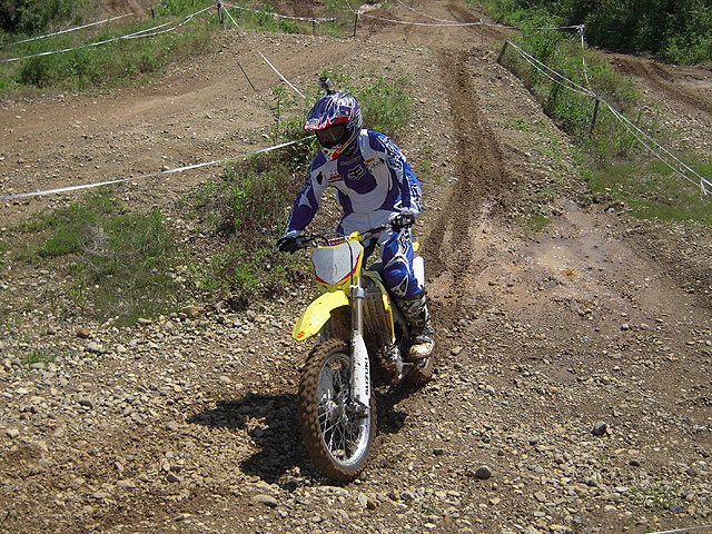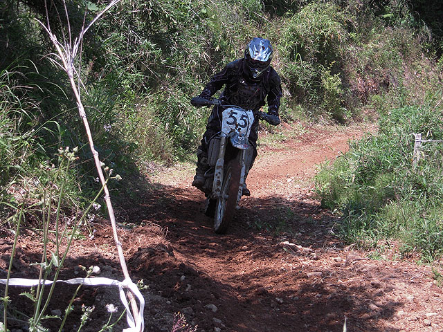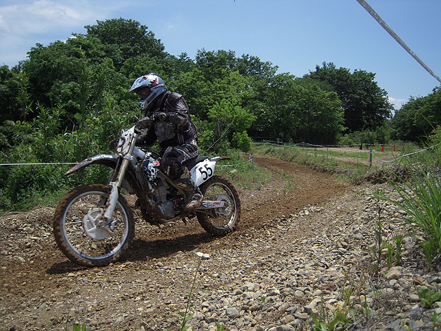 モチュールカップのスタートはルマン式。キック始動は2m、セル始動は6m、それぞれバイクから離れてスタートを待つ訳ですが、たった4mでは何のハンデにもならなくて、セル始動の人達がさっさと発進してしまい、自分はいつもよりはマシながら、前から2/3辺りで発進。出始めはぞろぞろと一列になって進むので、遅れては格好悪いので必死になって前の人に付いていきました。そして大坂を下って獣道を抜けて、いよいよ上り坂、と思ったら、a-かぁ殿とdb殿が坂の真ん中でもがいてました(爆)。Aクラスの人達は、上手くすり抜けて登っていき、中にはバイクから降りて押して上がる人も。自分は無理にアタックかけて、坂の途中で転けてもたまらないので、抜かれるままに坂の下で待機して、a-かぁ殿がどうにか押し上がってdb殿だけになってから、坂に突入! ところが案の定、エンスト。バイクを降りて押し上げるにも、地面がニュルニュルでブーツが滑る。エンジン掛けるのも大変で、掛かれば掛かったで足場が悪いのでバイクだけ前に行ってしまいそうになる。前回の斑尾大会でも滑るガラス坂で苦労しましたが、あんなもんの比じゃありませんでした。