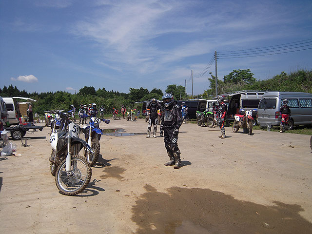 前回は雨続きで難しいセクションがカットされた訳ですが、今回は晴天続きで久々にベストコンディションでレース、と思っていました。前日はツインリンクもてぎにトライアルの世界選手権を観戦に行ったのですが、午前の早い時間にまとまった雨が降ったものの、昼間は晴れて良い天気。岩盤セクションの前の道路にごろ寝して観戦していたら、気が付いたら寝てたほどの陽気でした。ところが、フジガスやトニー・ボウらトップライダーが2周目を走り出した辺りから、空の彼方からドロドロと黒い雲が流れてきて、慌ててトランポに戻ろうとしたものの、雷付きの豪雨に捕捉されて、ホンダの博物館に逃げ込む有り様でした。雨そのものは、その後1時間くらい激しく降り、小雨になってからも1時間ほど降っていた訳ですが、BTC市貝のパドックに着く頃には上がって晴れ間が見えていました。