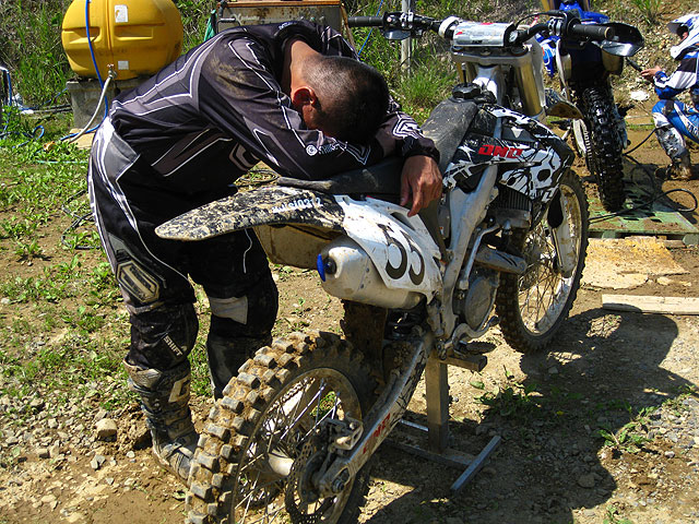 開けて翌日。朝方、濃い霧が出ていたものの、皆さんが集合する頃にはキレイに晴れて、良い天気。これで路面が良ければ、気持ちいいレース日和です。ところが、試走に行ったa-pro殿と先生のバイクを見てみると、結構泥が付いています。マディレース決定です。もっとも、やる事といえば、フロントフォークにシールスキン付ける事とタイヤの空気圧下げる事くらいです。あれこれ色んな人に聞いて回りましたが、結局、前0.8後0.75でチャレンジする事に。市貝のコースって、マディといってもそれほどグチャグチャで話にならん、というイメージがありません。