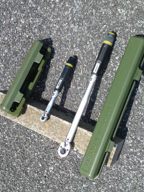 取り敢えず、サービスマニュアルとメンテ本を何度も読み返し、ネットでも調べて知識を付けて、大体作業の流れは頭に入れました。そこで、まず必要と感じたのは、トルクレンチとピンスパナ。トルクレンチは30N・mの小さいのは持ってますが、ステムナットを締めるには足りないので、プロクソンのマイクロクリック200/Sを購入。トップスレッドも規定のトルクで締めたかったので、トルクレンチ用の穴の開いている、KOWAのピンスパナを調達。多少出費になりましたが、腕に心得がない以上、道具はしっかりした物を用意しておきたかったのです。