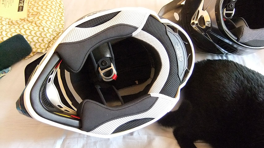 実は、ウェアをONEにした事で、ONEのヘルメットを買おうと思ってた時期があったのですが、試着してみると一番大きいサイズでもコメカミが痛くてたまらず、やっぱ国産がいいやという事で、ショウエイのVFX-Wにしました。