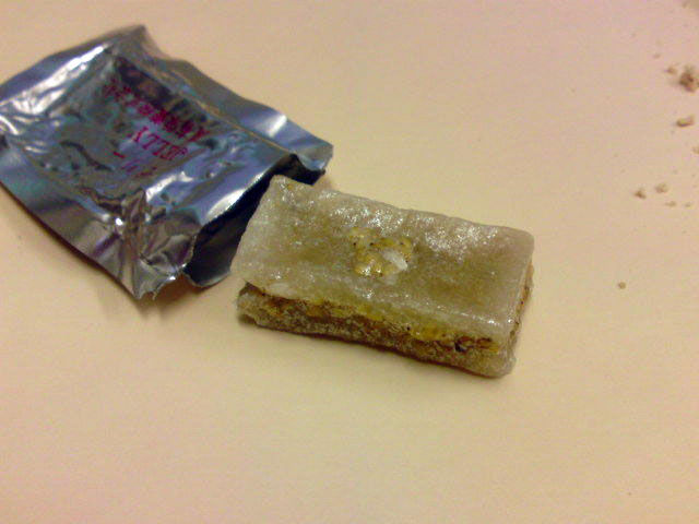 そんな感じですので、割るのも囓るのも簡単です。むしろボロボロしすぎるので、開けたら直ぐ食べた方が良いでしょう。味は、甘味のあるアーモンド味。あっさりしていて、この手の食料としては美味しいです。