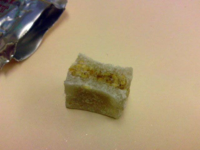 ゼリーと銘打ってますが、見た目はいわゆる和風ゼリー。法事の時とかにお婆ちゃんが出しくれそうな寒天ゼリーみたいです。間にゴマが挟んであります。日持ちさせるためか、若干乾燥させてあるようです。