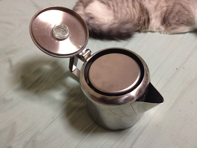 そこで目を付けたのが、パーコレーター。自分は別にコーヒー豆を挽いてドリップしたりする趣味はないのですが(それどころか、コーヒーはあまり好きではない)、まずあの形が好きな事。中のストレーナーを外せば普通にケトルとして使える事。そしてタダのケトルとしてでなく、パーコレーターの機能もあれば、キャンプなんかの時に重宝がられるかもしれないなー、と思った事。などなどにより、パーコレーターを装備する事にしました。