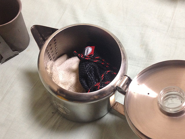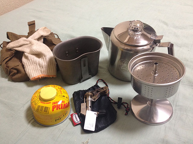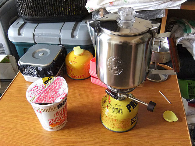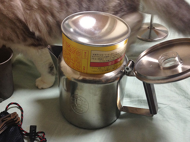 トランポに積んでいた炊事用具は兵式飯盒なのですが、最初の頃こそそれでメシを炊いたりしてましたが、その内面倒になってきて、コンビニやスーパーで弁当買ってきて食べるのが主流になっています。むしろ、カップラーメンやカップスープなどの湯沸かしをやる機会の方が多いのですが、湯沸かしに使ってるのがキャンティーンカップでは、一人分のお湯しか沸かせない訳で、2人以上だと順番になってしまいます。そこで飯盒を外して、パーコレーターを使う事にしました。