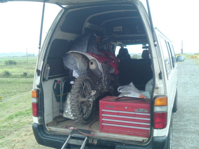 そしてトランポに積み込む時に感じたのは、全般的にきつかった、という事。恐らく、ベストテクバーに45mmのロアークランプよりも、純正のハンドルとトップブリッジの方が高いんだと思います。積み込む時は、リアフェンダーを抱える様な格好でリアホイールを持ち上げて位置を修正するんですが、10CRFよりも12CRFはマフラーが飛び出ているので、抱えにくくて慣れないウチは苦労しそうです。