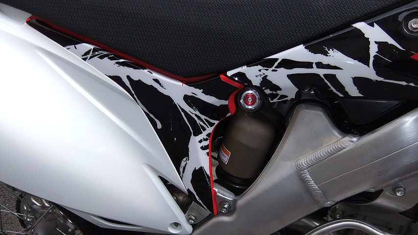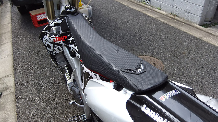 2012年モデルは、マフラーやステップ、キックアームなどが改良されている他は、基本的に2010年モデルの外観を引き継いでいますので、2010年モデルに使っていた装備が引き継げます。ONEの黒い外装はかなりくたびれていますが、練習用として残しました。また、まったく同じコスメキットが14,000円で手に入りましたので、そちらは本番用としました。つまり、中身は新車ですが外見は2010年モデルと同じ、という事になります。まぁ、2012年モデルのデカールで気に入ったのがあれば良かったのですが、無かったのでそのままで行く事にしました。