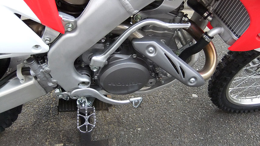 CRF250Rは2年お付き合いしたバイクなので、おおよその事は分かっているつもりでしたが、やっぱり2年落ちと新車では大分違う印象を受けました。そのもっともたるものが、背が高い、という事でした。新車に跨ってみると、両爪先がツンツン立ちなのです。今まで乗ってた奴は、爪先の指くらいまでが地面に着く、という感じで、足つき性がそんなに悪いと思ってなかったのですが、これは意外でした。