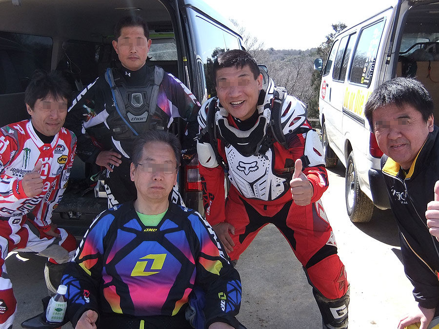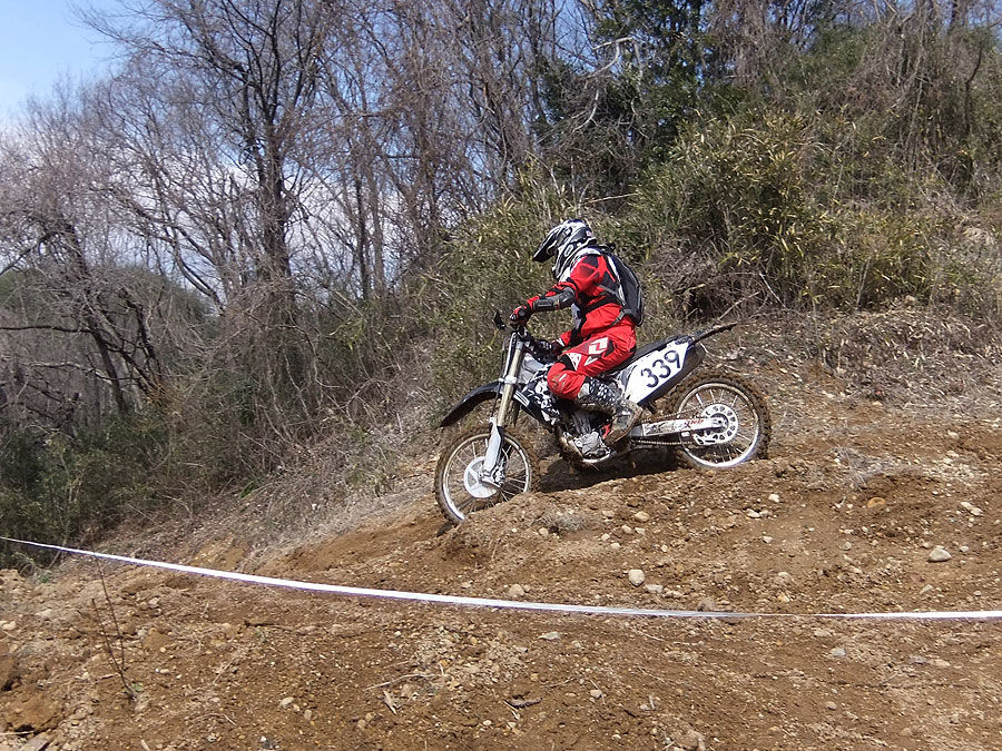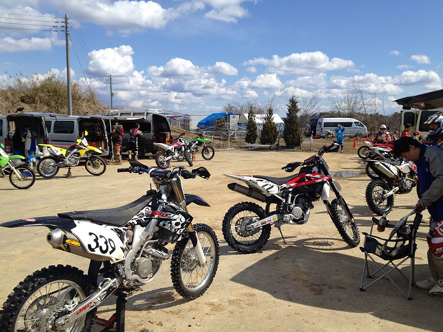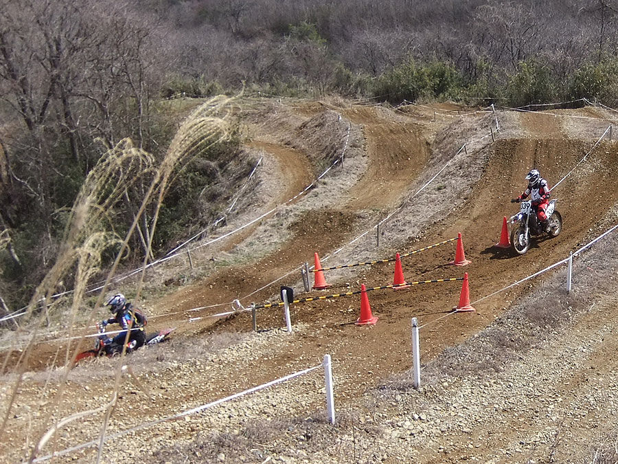 0945時、下見ラップスタート。南コースからケモノ道の大坂を下って、苦手なケモノ道を膝行って下り、南コースに上がる登り坂を意地で登り切り、南コースの外周はそこそこ開けて周回。MXコースからこれまた苦手な谷底へ向かう長い下り坂を下って、谷底の泥だらけのステップを2つ下って、ロックセクションをゆっくり通過。コーナーを上がるまでは細心かつ全力で走りきり、MXコースに復帰してチェックポイントを通過。フープスを越えて長靴コーナーから中級初級コース、初級コースの脇のアップダウン(2年前に下見ラップで転けてリタイアしたところ)を乗り越えて、桑畑コースに向かう苦手な下りの左コーナーを手堅く降下。以前はそのまま桑畑コースに行けましたが、今回はシケインが作ってあり、地面がフカフカするので用心して通過。桑畑コースは意外に乾いてて通過しやすく、そのままバリバリ開けて、あとはパドックに戻る直線を最大戦速で走って下見ラップ終了。