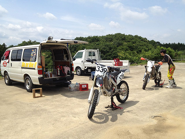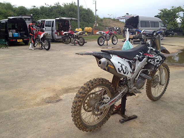 合間にモチュールカップのコースを少し走りました。取り敢えず、桑畑コースを走りましたが、レースの時とは打って変わって、ほぼ全線ドライで非常に走りやすい状態になっていました。前回の第2戦のワダチが残ったままなので、その点ではバランス感覚を必要とされましたが、ダイエットに成功して身体が細くなったせいか、バイクの上で自在に身体を動かす事が出来て、元気に走る事が出来ました。その後、南コースの下やケモノ道の方も行きました。BTC市貝は、宇都宮以外の人は、もっぱらスクール受けに来る人が大半だと思うので、なかなかエンデューロコースを走る機会がないと思うのですが、走ってみれば結構楽しい(初心者の人にはスリリングw)なコースですので、是非是非走って貰いたいものです。