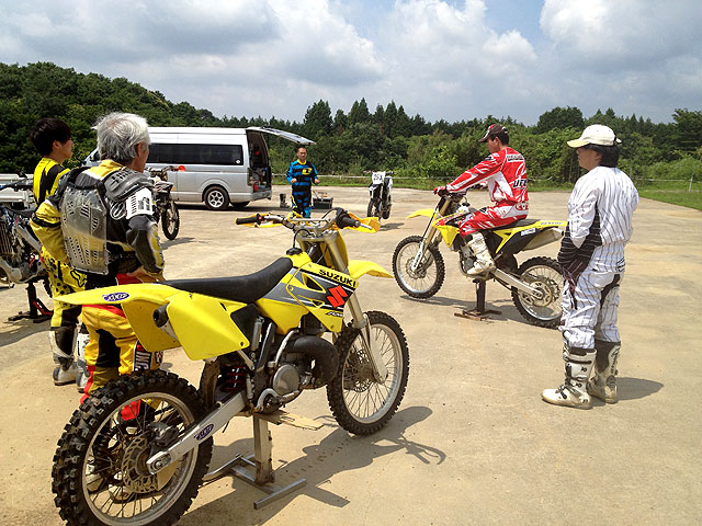 取り敢えずはパドックでフォームチェック。今回はスクール通って間無しの人もいましたので、現在のオフロードバイクの構造とライディング理論のおさらいもありました。自分は昨日、一通りチェックを受けていましたが、ジャンプの時のアクセルワークがおかしいという事で、踏み切りの時の姿勢を改めて習いました。これまで自分は踏み切る時にリアサスを縮めるのに、膝を使ってグッと押さえ込むものだとばかり思っていたのですが、実はこれが大間違いで、膝は減速姿勢で曲げた状態で固定して踏ん張るのが正解でした。続いて南コースでウォーミングアップ。人数が多いのでレベル別に別れて走行です。取り敢えず習った事を頭に置きつつ、元気よく走ってみました。ジャンプの踏み切りの時、膝を屈伸しないで固定して進入した方が、安定的に飛べる様です。時々前のめりにつんのめり気味の時は、もっと意図的に腰を引いて進入する様にしました。そうやって飛んでいるウチに、足というか膝というか、ガンと加重が掛かった時にアクセルを開けるんだ、という感覚が戻ってきました。