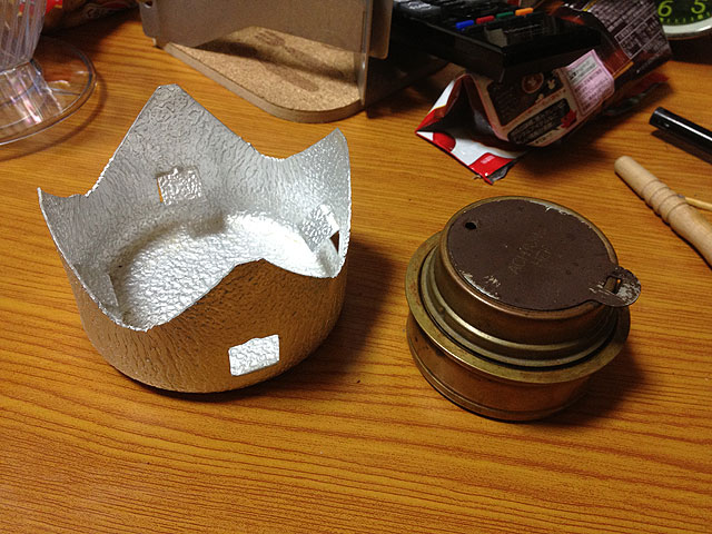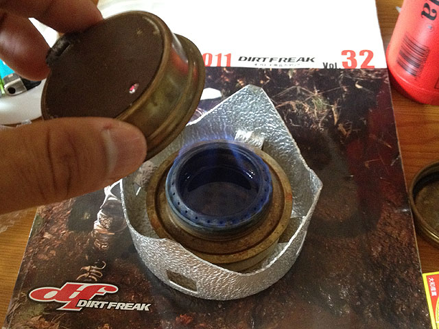 この五徳は、上がイケイケに開いてますので、火を消す時に火力調整キャップをポンと被せて消す事が出来ます。というか、それがこの種のアルコールバーナーの正しい火の消し方なので、それが出来る様に考えて作ったのでしょう。これがバーナーヘッドに載せるX型の五徳だと、まずX型の五徳を外さねばならないので、ちょっと面倒です。