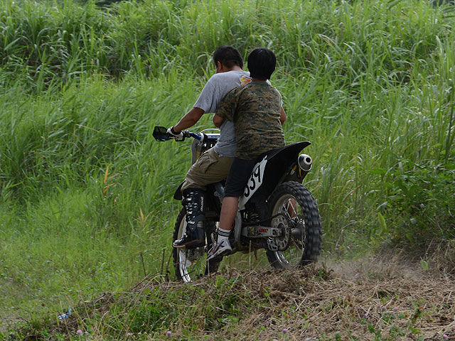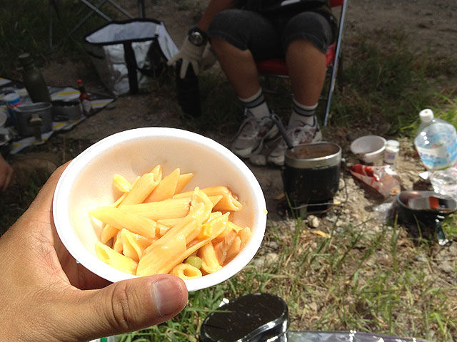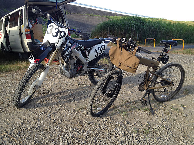 続いて出来てたのが、ヒューゲル連隊長殿が持ってきた、ご家庭用もんじゃ焼き。宴会用固形燃料を使う、宴会で出て来そうな三つ叉の五徳の上に、小さい銅鏡みたいな鉄板が乗ってます。そのちいっこい鉄板の周りに、6人が車座になっている訳ですが、恐らくそのもんじゃ焼きはせいぜい1〜2人用を対象としてしか設計されていないでしょうから、明らかに人数が多すぎですww しかも、自分のトランポのハッチバックの前で、MTBやモトクロッサー駐めたソバで、ヘンチクリンな6人が何か突き合っている訳です。何台かオフロードバイクが通りがかったのですが、皆さん変な光景に釘付けでした。