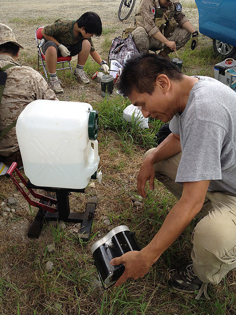 こんだけアウトドアグッズが発展した時代にあって、古色蒼然たる固形燃料だけ使って料理大会やる、なんてのは他で話しを聞いた事がないので、おそらく自分らが本邦初の取り組みだと思うのですが、やるからには失敗しても面白おかしくやるのが自分らの流儀です。むしろ「失敗してなんぼ」と言うべきか。しかし、失敗しようとして失敗するほど世の中は優しくはないので、やってる方は意外に真剣。その真剣さが端から見てると面白い、という感じです。まず、大原則として使える火器は、固形燃料だけ。具体的には、エスビットの様なタブレットタイプの物や、よくホムセンなどで見かける缶入り固形燃料、宴会なんかのお一人様用の焼き物や鍋に使う宴会用固形燃料、ジェルタイプの着火剤、等々、アルコール系やパラフィン系の固形燃料に限定しました。ちなみに、ロウソクは有りですが(昔の戦争の本でロウソクで飯盒飯炊いてる写真があったからw)、木炭は禁止としました。
