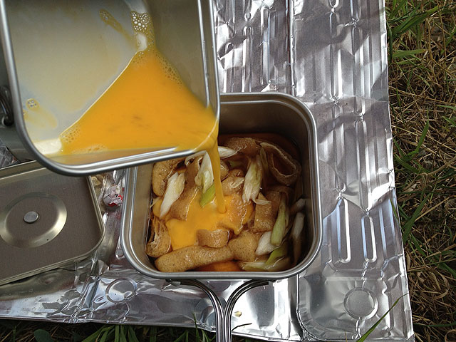 まず、油揚げとネギを料理ハサミで薄切りにして、それにめんつゆ適量と同量の水を入れ、コンロに掛けて温めます。その間に卵割ってかき混ぜておきます。ネギがしんなりしてきたら、固形燃料を新しいのを投下して、沸騰気味にさせて、溶いた卵を入れてフタをします。グツグツイイ感じに卵とじになったら完成です。