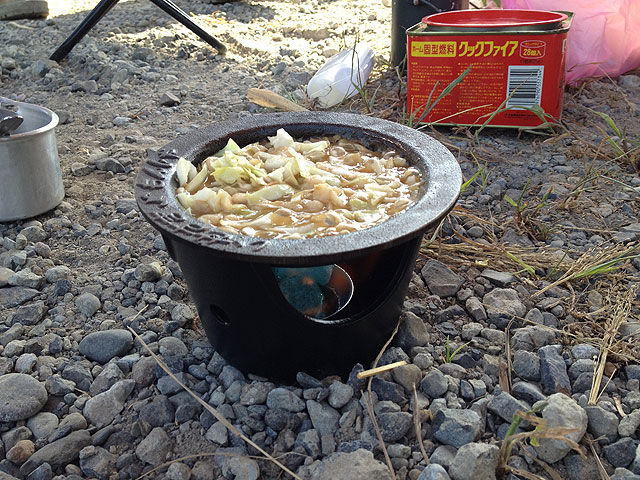 まずやらねばならないのは、飯を炊く事。飯盒に2合の飯を入れ、3回研いで浸水を待たずに炊きました。丁度トランポの荷室で水がぬるま湯みたいになっていて、お湯で炊く感じでした。使った火器はエスビット。当初はデカイ天ぷらガードで風よけを作るつもりでしたが、大して風が吹いてないので吹きさらしでやりました。ところが、意外にも火力が強い。ボコボコと沸き始めました。ただし、屋内より燃料消費が激しい様で、無くなる前にポンポンとタブレットを追加する必要がありました。そしてタブレットを2/3箱ほど消費した時点で、イイ感じに炊きあがりました。