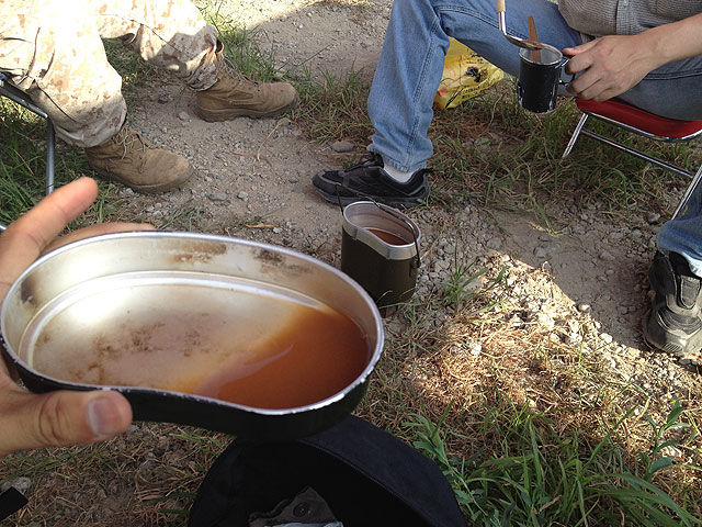 さて、全ての出し物が終わり、締めはシュヴァルツのヨハン氏の代用コーヒーとなりました。代用コーヒーとは、戦時中などコーヒー豆の輸入が止まった時に、大豆だのタンポポの根だので作られる代用のコーヒーの事で、今回は落花生でやってみた、との事。ピーナッツなどコーヒーになるのか、と思って聞いてみたら、「近所のお婆ちゃんが自家栽培してるのを貰ってきて、干して感想させて、自分で煎って、スリコギで粉にしてきた」との事。恐らく煎るのも固形燃料でやったに違いありません。自分らに比べると、恐ろしく手間が掛かっています。で、淹れ方を見てみたら、おもむろに飯盒に湯(といっても、エスビットなのでぬるま湯w)を沸かし、それに粉をドッと入れてかき混ぜるだけ。上澄みを飲むトルコ式コーヒーっぽいです。が、匂いはまんまピーナッツでした。そして出された茶色い液体を飲んでみましたが、ピーナッツ汁だと言われたらそれなりに美味い。もうちょっと濃かったらチベット茶っぽいかも。でも決してコーヒーではないww 作った本人曰く、今回は絶対イケる!(実は以前、大豆で作ってみたら、ただのきな粉汁だと言われて発奮したらしい)と思ったそうなんですが、高い探究心、懸けた努力の割には残念な出来映えで、まさにコケネンアワードを受賞するに相応しい一品となってました。