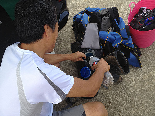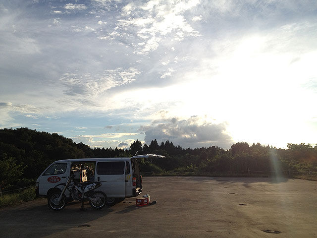 今回もいつもの様に前日から現地入りして、コースの設営を手伝いました。関東近県では、熱帯的スコールに見舞われる所が多く、中には土砂降りの所もあった様ですが、ベストテクコース市貝はこれでもかのピーカン。コースの底のロックセクションの部分以外は、カチンコチンに乾ききっていました。今回は時計回りという事で、獣道と大坂は登りで使うとの事でしたが、こうも乾いていればどうやったって走れる自信がありました。競争にはならなくても、走れるかどうかは重要なのです。今までは走れる自信すらなかったのですから。走れると踏んだからには、体力というか、左肩は本番まで温存しておきたい。その様な訳で試走はサボるつもりでいたのですが、先生から「走るの?」と聞かれたら、「はいっ!」と返事してました。そこでへのはのと言い訳したのではベストテクの生徒じゃありませんw 先生からそう言われた時は、何か教えて貰える時なのです。今回も教えて貰ったのですが、それは画期的な、完成形ならぬ完結形(完璧形だったかな??)でありました。習った事を頭で反芻しながら用意をしてたので、リアットブレース着けただけで、チェストプロテクター着けるの忘れて走り出すほどでした。