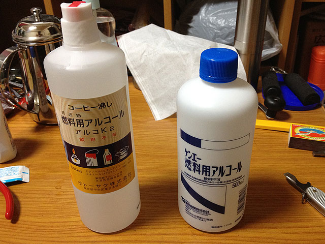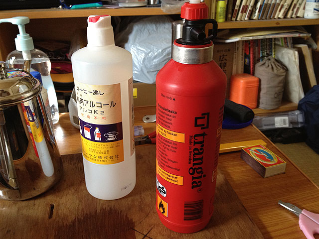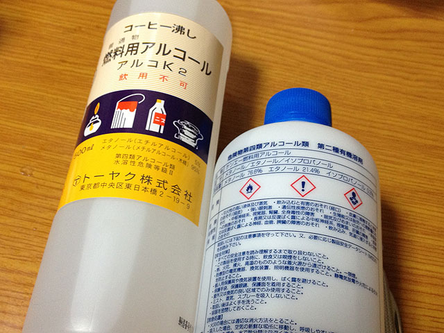 燃料アルコールも色んなメーカーが出していますが、容器は大別すると、細長い注ぎ口があるものか、太い瓶型のどちらかに分かれる様です。細い方はコーヒーサイフォン用、太い方は理科の実験で使うアルコールランプ用なのかもしれません。どちらも飲んだら目が潰れるメタノールが主成分ですが、成分表を見ると若干中身が違う様です。といっても、実用上、差はほとんどないのですがw