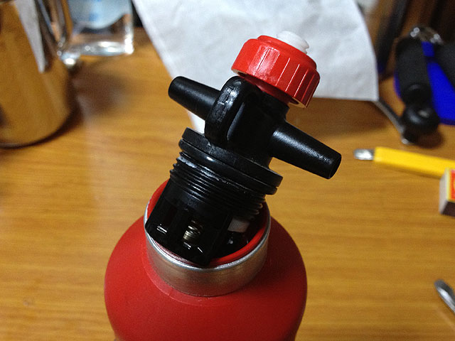 このフューエルボトルが発売された時にちょっとショックだったのが、プラ製だったという事。普通、燃料ボトルというのはアルミとかの金属が定番で、プラというのはそれこそアルコール用くらいしかなかったのですが、これが立派にプラ製です。入れれる燃料は、アルコール、ガソリン、灯油、などなど。大抵の燃料は入れれる様です。むしろ逆に金属製のボトルはアルコールを入れると腐食したりする物が多いのですが、このボトルはプラですのでその心配はありません。むしろ油性燃料を入れたらプラが溶解したりしないのかな、と思うのですが、その点はクリアしているのでしょう。このボトルの一番の特徴は、「セーフティーバルブ」と称されるキャップで、キャップに付いた赤いナットを緩めると、燃料を出すボタンを押せる様になって、両サイドに付いている注ぎ口から燃料を出せる、という優れた機能がある事です。赤いナットを締め込めば燃料が漏れ出る事はありません。これまでのボトルはキャップを回して外す手間がありましたが、これにはそれがないのが優れていると思います。