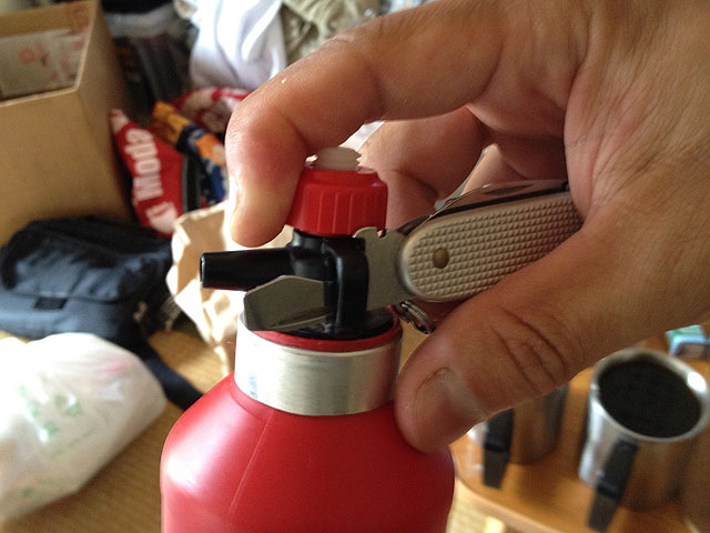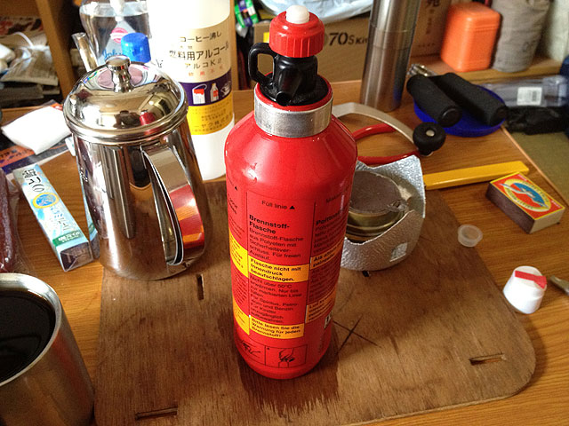 このボトルを買って一等最初に驚いたのは、結構中にバリが残っていて、使う前に濯いで出さねばならなかった事。まぁ、成型で作っているのでしょうが、燃料ボトルとしてはこの雑さは困ります。次に、キャップが殊の外、固いという事です。恐らく、内部で揮発してキャップが爆裂しないように、という事で、ボトルの首の所は金属の輪っかが填っているのですが、キャップを付けているウチに締まってくるのか、手で開けるのは結構難儀します。キャップの真ん中にヒモを通す穴がありますので、そこに棒状の物を入れて、テコの原理で開ける様にしています。