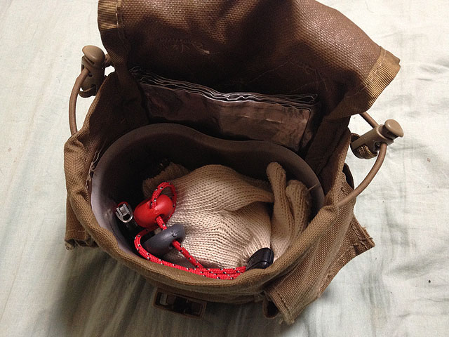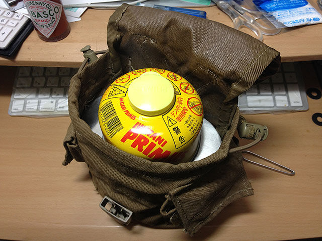 ジェネラルパーパスポーチですから、何を入れても良いのですが、自分はもっぱらプリムスP-153やトランギアTR-B25といった、小型のガスバーナーやアルコールストーブのセットを入れる様に買いました。これらの小型ストーブはバーナーとカートリッジがバラだったり、細々とした装備品があるので、ひとまとめにしておきたいものです。キャンティーンカップをハードケース代わりにして、このポーチに収める事でまとまりのある装備としようという訳です。(2013.2.26追記)