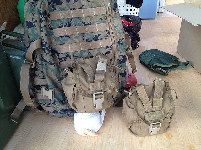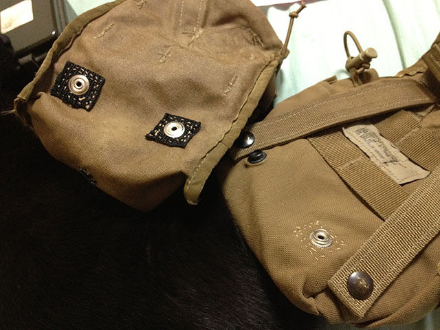ところで、このカバー(というかポーチ)は、1QT、つまり1クォート(約1リットル)のキャンティーン(水筒)を収納する為のポーチで、その収納の仕方は上の写真の通りなのですが、最近はキャメルバッグ等のハイドレーションシステムを使う事が多いらしく、キャンティーンはあまり使ってない様です。そのせいか、このポーチの名称も「1 QT CANTEEN/GENERAL PURPOSE POUCH」となっており、どちらかというと、ジェネラルパーパスポーチとして役に立つ様に作ってあります。