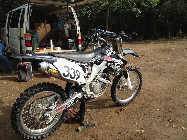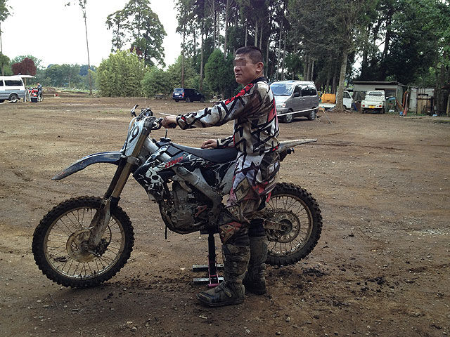 当日は上手い具合に天気が回復したのですが、前夜までは雨が降っていた様で、デコボコランドの本コースは雨の流れた後が随所に残っていました。取り敢えず試走という事でコースインしましたが、どこをどう走っても滑りそうで、怖くてアクセル開けられません。しかも、本コースの最後の方のでは道幅一杯に広がったデカイ水溜まりが出来ていて、ゆっくりアプローチしてもウォータースライダーみたいです。3周ほど気を付けて走りましたが、腹の下まで水を被ってしまいました。本コースで難しかったのは、コース入って直ぐのタイトコーナーのあるアップダウンで、元もと掘れてる上に、滑りやすくなっていますし、その手前のダラダラの左コーナーも、うっかり車体が寝たままアクセル開けると転けそうな感じですので、車速に乗せてアプローチしにくい感じでした。なので一等最初は失敗してしまいました。あのアップダウンの登りは左側のラインを選ぶ人が多いらしいのですが、自分は掘れていても右側を走っています。しかし、デコボコに弾かれて左に流れていくので、とにかく上まで上がりきって、大回りする感じで右に折れて降りていく、という感じでした。