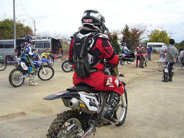 コース設定が終わって、いよいよ試走。日が暮れるのが早いので、ちゃっちゃとコースインしました。取り敢えず最初の1周はゆっくり、と思ったのですが、いつもの様に2速で走っていると、なんとも遅い。あまりにも遅い。しかも何故か疲れる。しかし、3速でモチュールカップのコースを走った事はありません。しかし、こうも遅かったんではたまったものではありません。そこで大丈夫そうなところで3速に上げてみました。すると、そっちの方が遙かに楽だという事に気が付きました。幸いにもコースは乾き過ぎずのベストコンディションです。思い切って開けれそうな所をは開けてみました。するとなお楽です。そんな具合で、2周目からはヤバそうなトコ以外は出来るだけ3速で走る様にしました。