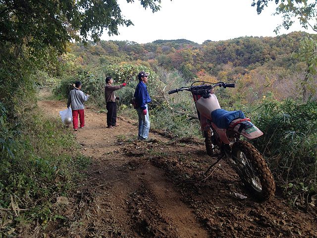 コース設営では、一応長靴を履いたのですが、コースはほとんどドライコンディション。しかも先生が延べ30時間ブルを入れたとあって、平らでコース幅もちょっと広がった感じ。気になる天気も、翌日夜まで降らない予報でしたので、全周使う晴れコースになりました。難しそうなのは、ロックセクションからの粘度路面ですが、ここもロックセクションの下の泥をブルで掻き出したとかで、以前に比べたらかなり走りやすそうになっていました。桑畑コースも獣道もほとんど濡れてないとなると、ハイスピードレースの予感です。