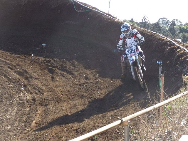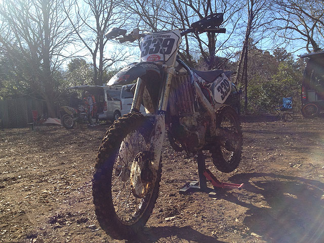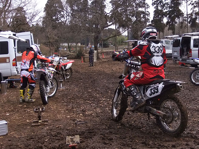 中1日開けて、今度はとっしー殿の練習。とっしー殿は去年3月のヒーローズアダルト第3戦で骨折して以来の正式復帰です。なのにコースコンディションはグッチャグチャ。コースどころか、パドックそのものがグチャグチャで、バイク下ろして少し前後させただけで、タイヤに土が絡まって車重が重くなってしまいます。こんな日が復帰初日とは、とっしー殿も気の毒な事ですが、こんな時こそマディの練習と思うしかありません。