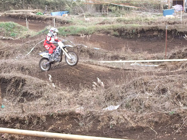 3日は比較的暖かかったのですが、5日はじっとしてたら寒くなってくる感じでした。しかも空は晴れず次第に曇ってくる感じで、地面が乾く気配もありませんでした。もとよりこの日は本コースだけを走るつもりでいたのですが、3日にウッズを走るよりもヒドイ土の付きようで、これでウッズなんぞに行ったらエライ目に遭うの間違いなしです。それでも午後になると、ちょっとは身体が慣れてきたのか、少しは開けて走ろうという気になりました。以前との違いを感じたのは、タイトなコーナーで突っかかる事なく、比較的スムーズに回れた事。これは年末にスクールで習った腹の動かし方がテキメン効いている様でした。回り方も立ち上がりの加速の入れ方もスムーズでストレスを感じませんでした。ただし、これは必然的に車速が落ちるタイトコーナーの場合であって、車速をあまり落とさないダラダラコーナーやシケインなどでは、車体を倒し込むと滑りそうで怖くて倒せず、結果的に車速を落として回る他なく、走ってる自分でも遅いと感じる走りでした。
