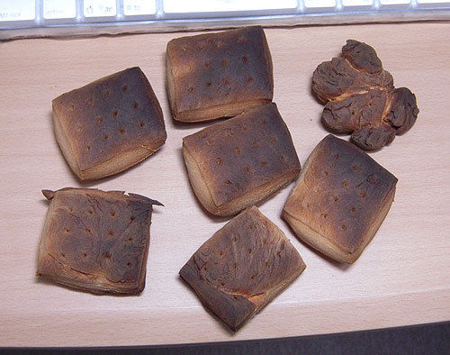 それでも苦労して全部食ってみた。焦げてない所は、それなりに香ばしくて美味かったが、厚みが有りすぎたのか、ちょっと湿気った感じだった。半分はかみ砕き、残り半分はそのまま口に入れたが(噛むのが疲れたから)、当然、まったく歯が立たないので、口に紅茶を含んで、モグモグして食いきった。残り6つ、食う元気も自信もない。
