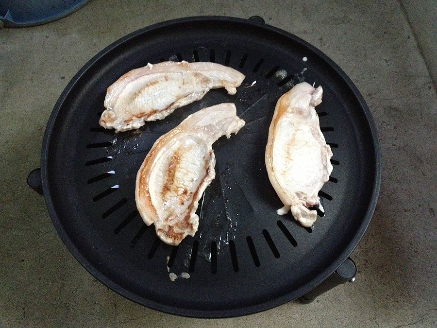 あと、臭いとか油煙とかのインパクトが意外に少ない事。炭のBBQの場合、肉から落ちた脂が燃えるので、結構臭いも油煙も出ますが、このコケネンBBQコンロは脂は脂受けの水に落ちて燃えないので、食材が焼ける時の煙しか出ません。