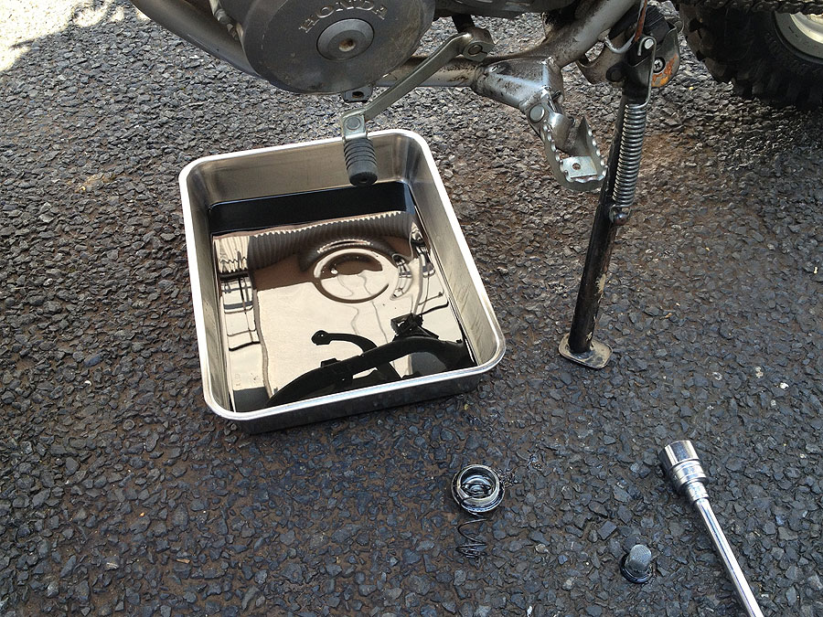 オイル交換をしました。普通、オイルフィルタがあるはずなのですが、XR230はメッシュの網だけです。こんなんで細かいスラッジが除去できるのか判りませんが、マメにオイル交換した方がイイのでしょうか。オイルの排出口には、ドレンボルトならぬキャップが嵌っているのですが、24mmのソケットが必要です。サイドスタンドを立てて車体を斜めにしてオイルを出したのですが、いつまでもポタポタ出てましたが、試しに車体を真っ直ぐに立てたらポタポタポターと残ってたのがまとまって出ました。G3オイルを1リットル入れて交換完了。次はタイヤ交換をやろうと思ったのですが、アスクルナットがめっちゃ固くて回りません。どんなに頑張っても、スピンナーハンドルがしなって、それ以上やるとナットをナメてしまいそうです。手に負えないと判断して、後日バイク屋さんに頼むことにしました。恐らく、前回タイヤ交換した時に、規定トルクを無視してインパクトレンチでバリバリと締めたのではないかと思います。しかもねじ山にグリスを塗った形跡もないので、固着したのかもしれません。