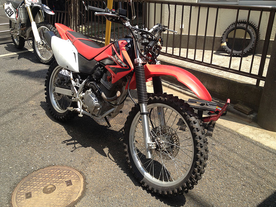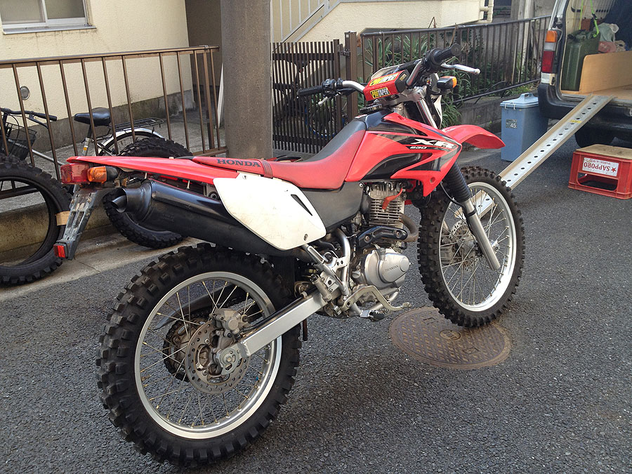 トレール車からモトクロッサーに乗り換えて早5年。未だに扱いかねてるところもあるのですが、その一方で結構前から小さめのバイクも欲しいなぁ〜、とか思ってたりしました。モトクロッサーは比較的真剣に乗る目的の物に対して、セカンドバイクたる小さめのバイクは、色々遊べるマシンとしての位置づけ。欲しいと思いつつも、いざ買うとなると先立つ物もないし、第一何買って良いか分らん、という案配で1年以上経過してしまいましたが、この度、いい感じに2005年モデル(推定)のXR230を調達する事が出来ました。