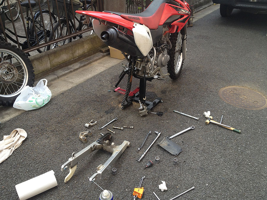 CRF250Rのリンク部のベアリングはニードルタイプで全部バラバラに出来るのですが、XR230はカラーに封入されているタイプです。そこで徹底的にパーツクリーナーをぶっかけて汚れたグリスを洗い流し、カラーやボルトもキレイにし、ついでにスイングアームやフレームにくっついてるギトギトの油と泥の汚れを、出来る限りキレイに掃除しました。リンク&スイングアームの組み付けは、CRFと変わらんくらいに簡単です。
