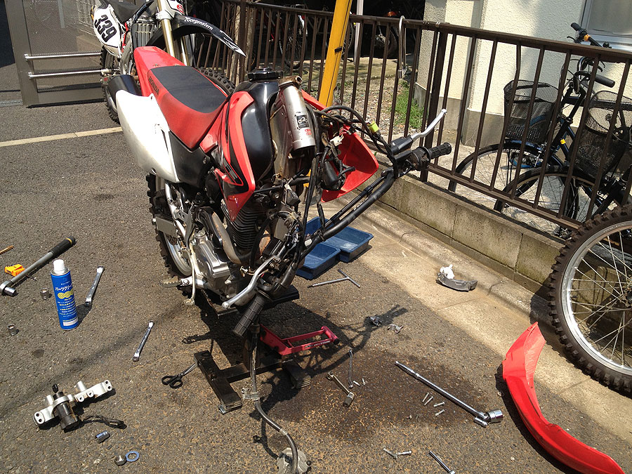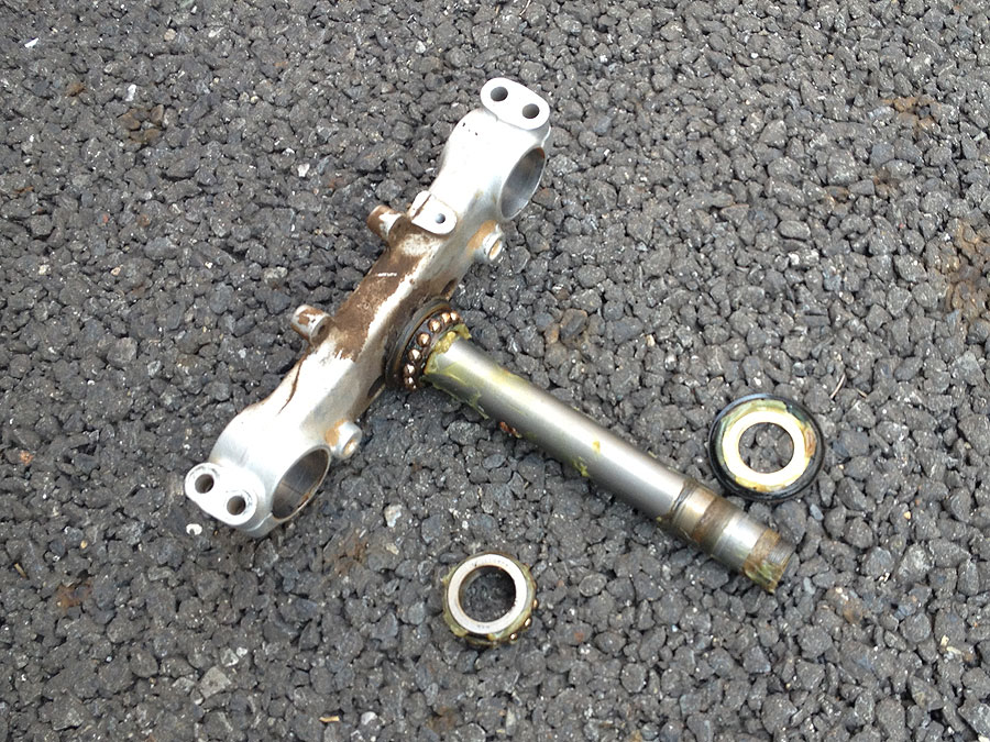問題はステムの方で、こちらはハンドルから色々ケーブルが出てますし、それ以上に面倒臭いのがフロントブレーキホースで、XR250みたいにしててくれたら良いのに、どういう訳か、ロアステム、フロントフェンダーにもホースを留める様になっています。整備性が悪いだけでなく生産性も悪いんじゃないかと思うのですが。ともかく、フェンダーもフロントフォークも外して、ステムを全バラにしました。
