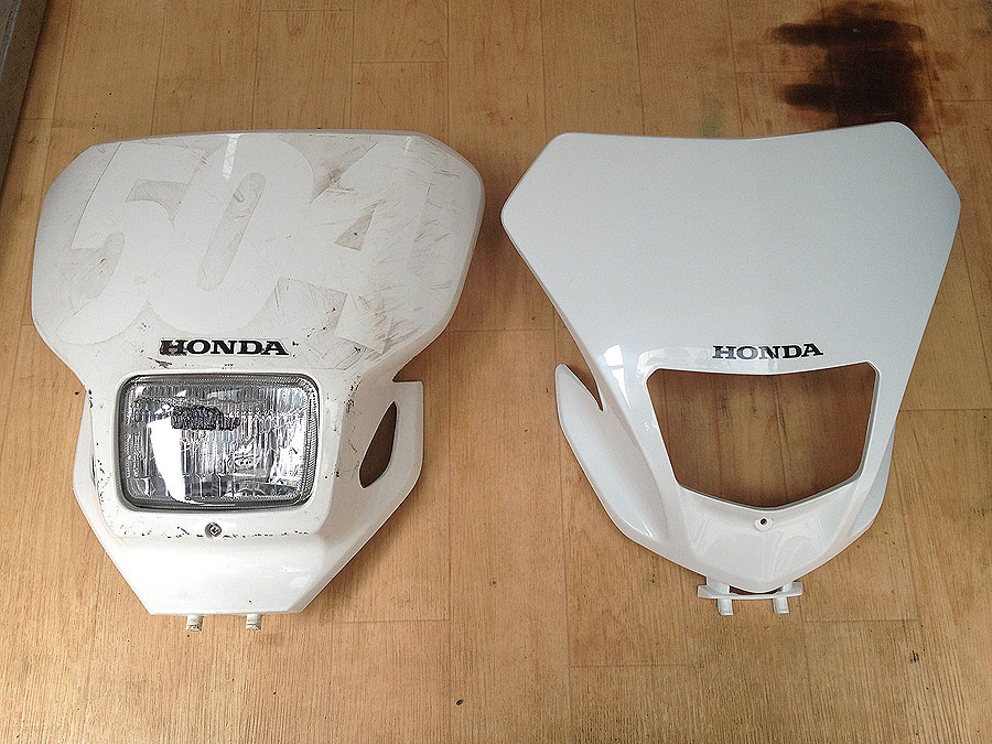 新型のライトカウルはバイク屋さんに頼んでいたのが届いていたので、早速取り付けてみました。旧型の物に比べて小ぶりでスマートで格好良いです。ライトの穴は昔はビニールテープなどで塞いでましたが、今回はZ-CARBONのヘッドライトエリミネーターを取り付ける予定ですが、これもまだ届いていません。