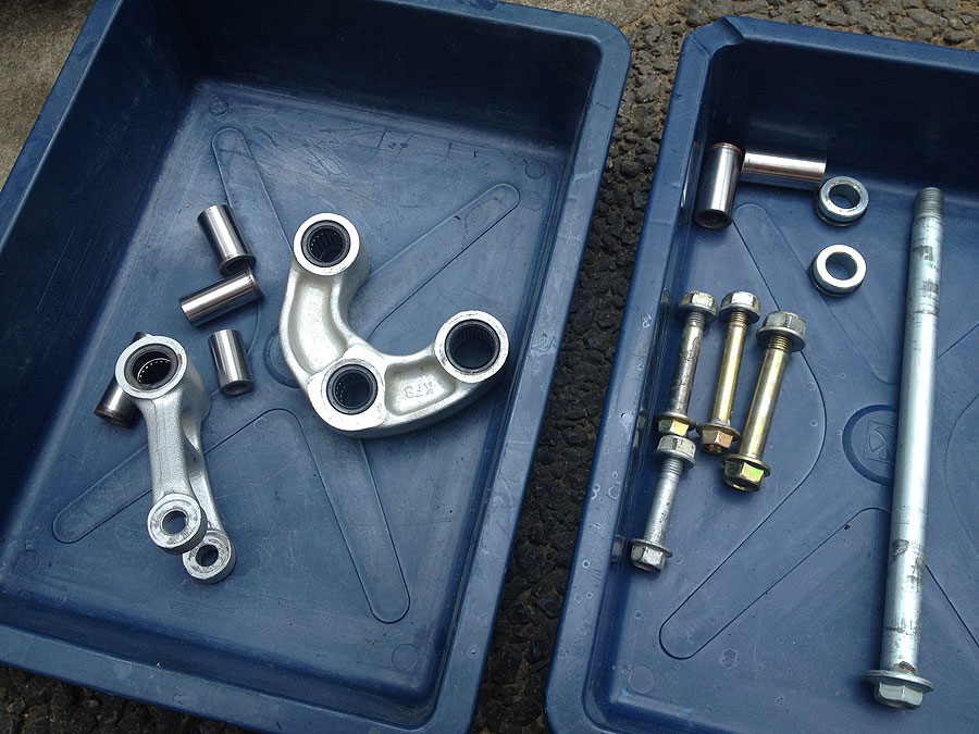 頼んでいたパーツは昨日のウチに大体揃い、いよいよ艤装作業に取り掛かれます。いつもそうなんですが、ドドっとパーツが届くと、なんかワクワクしてくるんですよんね。早く届いたパーツを組みたいところですが、まずは先にリンクとステムのグリスアップをやる事にしました。恐らく、リンクもステムも購入時のまんまで、グリスは全然入ってないか、劣化してるかのどちらかであると思われたからです。そしてリンクに関しては、予想した通り、グリスはベアリングに少し入ってただけで、しかも黒灰色に汚れてました。ボルトには全然グリスが塗ってなくて、一番下のボルトとカラーは若干錆びていました。スイングアームもピボットシャフトも、グリスが塗ってあった形跡があっただけで、ベアリングにはちょっとしか塗ってない状態です。