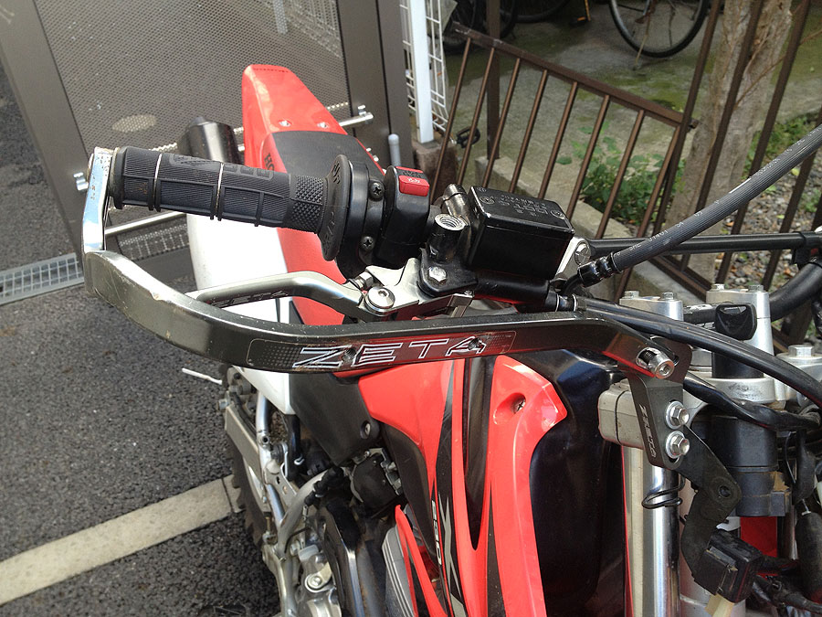 問題は、ハンドルを純正からZETAのCXバーのED-Medium(815mm)に替えたため、左右が長くてハンドガードがマウントに届かなくなってしまいました。そこで取り敢えず左右5mmずつカットしたのですが、それでも届きません。そこで、ハンドルを3メモリほど起こしてみたところ、どうにかマウントにハンドガードが届く様になりました。